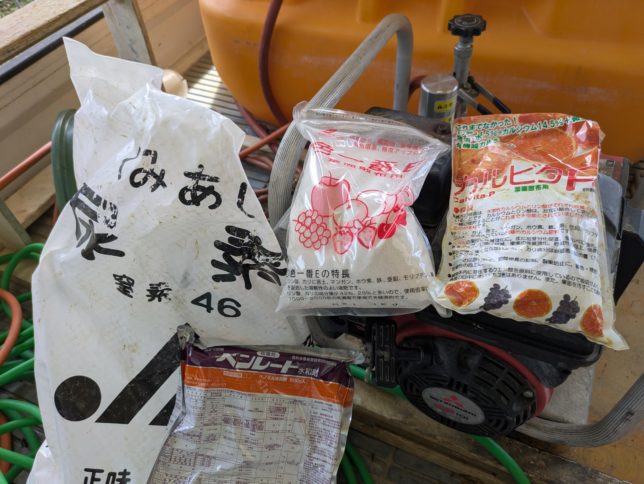 今日はだいたい曇り。気温は30℃までいかなかったようだ。朝からオヤジは紅まどんなに農薬と液肥の散布作業。今日の農薬と液肥がこちら。