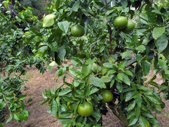 ベンレートは殺菌剤で、収穫後の腐敗防止のための農薬。通常は収穫直前に散布するのだが紅まどんなはこれから袋かけ作業をして、そのまま収穫する。そのために袋掛けする前に散布する。カルビタPは栄養剤。果皮増強に効果がある。デコポンではずっと使っていて効果は実感している。紅まどんなもクラッキングが問題になるんだが、たぶん効果はあるはず。2年前から年2回はかけるようにしている。その左の色一番も栄養剤。色づきがよくなり、味もよくなる、とか。その左は尿素。窒素補給。人間でいえばごはんかな。午前中いっぱいやって、三分の一ほど残った。紅まどんなはいい出来だと思う。そろそろ少し色づきはじめている。問題は収穫前あたりのケモノの被害だ。