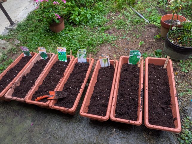 朝から雨。天気予報より雨が降り出すのが早かった。今日は農作業はお休み。朝イチはプランターに野菜の種まき。