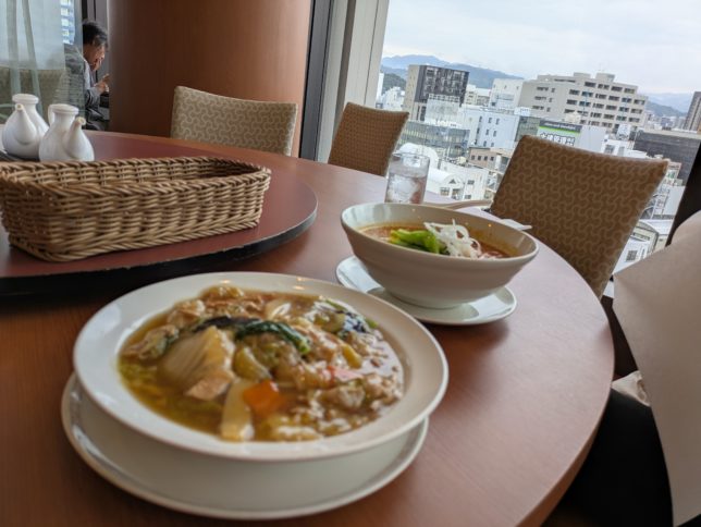 10時ごろから奥方と外出。行き先は松山の伊予鉄高島屋。北海道の物産と観光店をやっている。去年も行ったかも。お昼は高島屋の8階の四川飯店で。陳健一さんの直営店らしい。頼んだのはオヤジはいつもの五目あんかけ焼きそば、奥方は坦々麺。