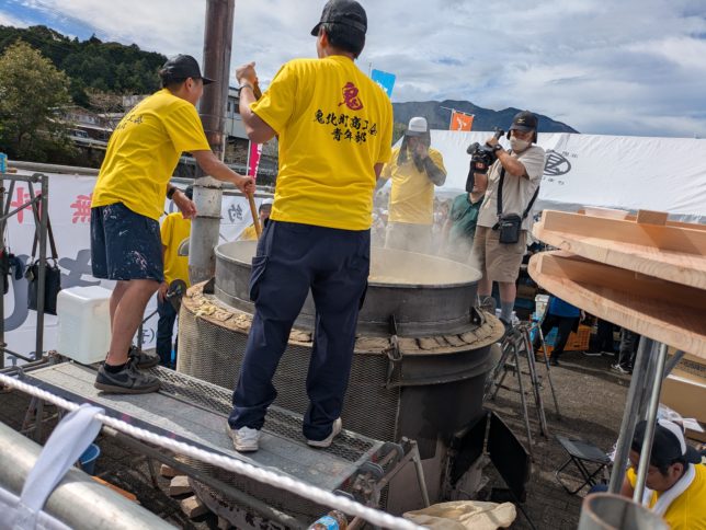 今日はお休み。お休みも大事だ。朝ゆっくりしたあと、奥方と鬼北の「でちこんか」に行った。最近鬼北に行く機会が多い。毎年おこなわれているようだが、大きなイベントらしい。昨夜は太鼓と加藤登紀子のコンサートがあったらしい。今日は11時からキジ鍋がただで振る舞われる。イベントとしてはダンスや愛媛プロレス、午後からは爆風スランプのサンプラザ中野とパッパラー河合の公演があるらしい。「でちこんか」は南予地域の方言。たとえば何人かで飲んでいて、友人を誘うのに、「今飲みよるけん、お前もでちこんか」、などと言うんだが、結局「飲みに出てこいよ」というぐらいの意味かな。オヤジたちは10時半ごろに鬼北の奈良川河川敷に到着。すでにキジ鍋の行列ができていて、それに加わった。なんだろね、人がすごく多い。こんな中で行列を作って並んでいるのも楽しい。キジ鍋を作成しているのを覗いたのがこちら。大きな鍋で何人かでかき混ぜていた。