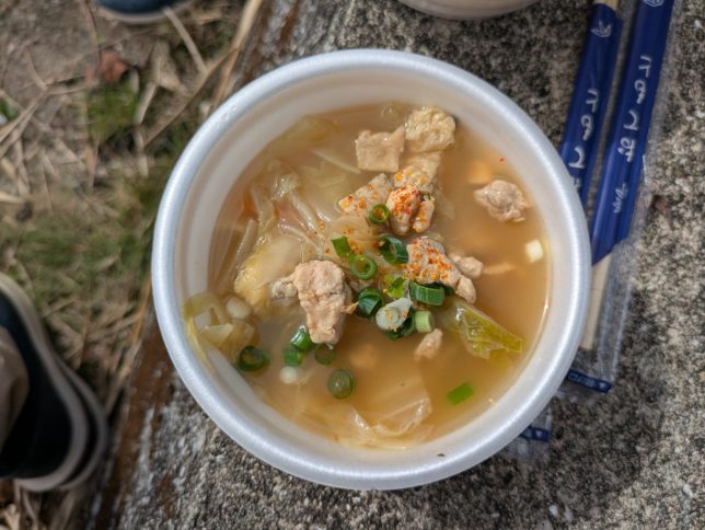1時間近く行列を作ってゲットしたキジ鍋がこちら。あらかじめ調理しておいたキジ肉がたっぷりトッピングされていてまずまず。