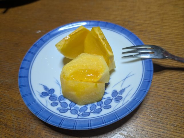晩御飯のデザートに10月7日に収穫して渋抜き中の渋柿をいただく。もう十分渋がぬけている。硬さも外側は少し固め、中側がちょっとトロッとしていて絶妙なかんじでした。