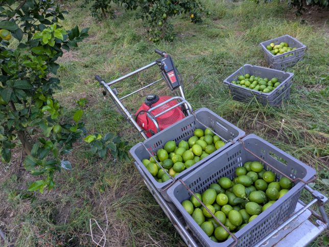 奥方は和田地区のレモンの収穫の続き。午前、午後やってコンテナ9杯ほど。最後に倉庫に持ってかえるのはオヤジの仕事。運搬車の力丸くんが活躍だ。