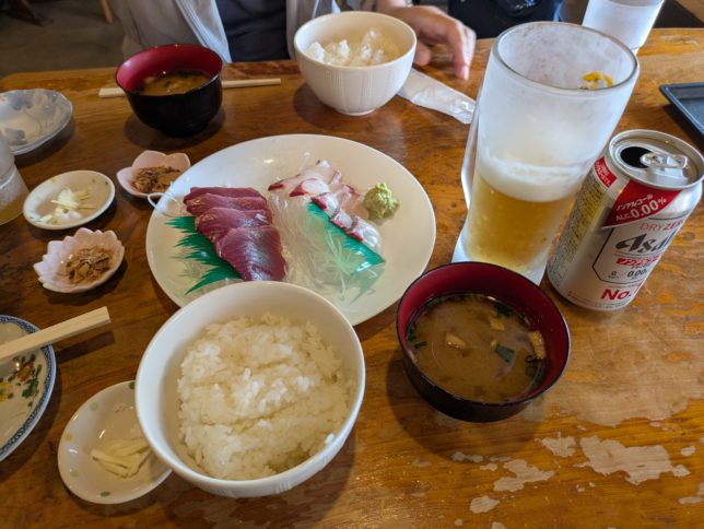 まずは田中鮮魚店で食べたい魚とごはん、味噌汁券を購入。少し待ったあとお向かいの漁師小屋で料理をいただいた。買った魚はカツオとシマアジの刺身だ。