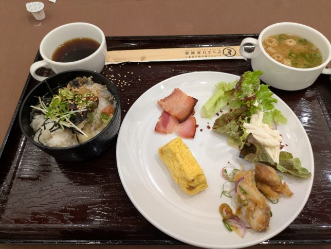 高知で二日目。ホテルで7時半ごろ起き出して、朝食。普通のバイキング。ただ一品、うつぼの土佐茶漬けというのがあったので選択。オヤジの朝飯がこちら。