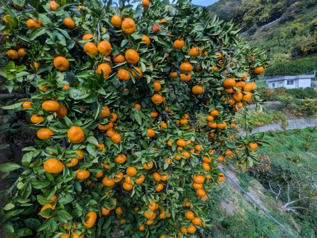 寒風が吹くなか、ミカン採り六人で頑張って夕方までにこの園地終了。明日が最後の園地になる。城川から来てくれている二人が、明日雪になってこれなくなるのが心配だ。