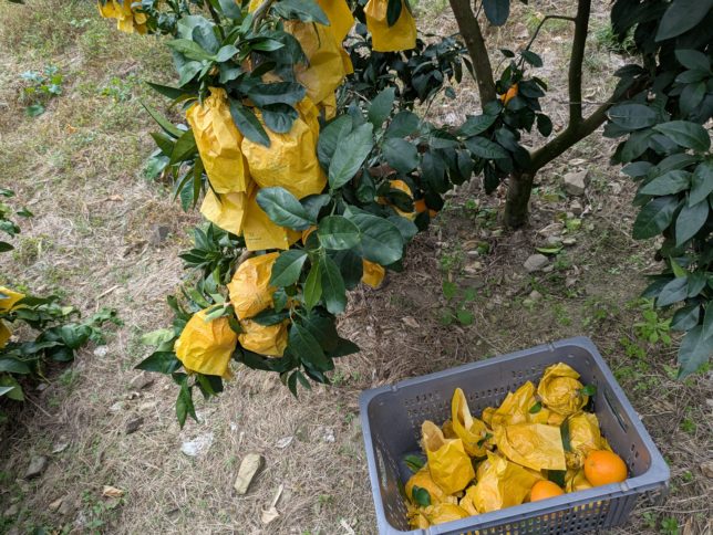 朝はくもり。天気予報も微妙。みかん園主にはストレスが多い天気。昨夜雨が少し降る予報だったが、大丈夫だったようだ。無事みかん取りメンバー六人集合。行司が谷の南西斜面の南柑20号の収穫作業。午前10時ごろこの園地終了。これで南柑20号の収穫は終了だ。ひさしぶりに、ヤッホー。そのあとは隣接する紅まどんな園地の収穫作業。収穫は袋をかけている状態で行う。昨年の袋掛けとなしでの比較では袋掛けしたほうが収穫後の腐敗果がだいぶ抑えられているようだ。収穫時の傷の少なさが要因かな。収穫作業がこちら。