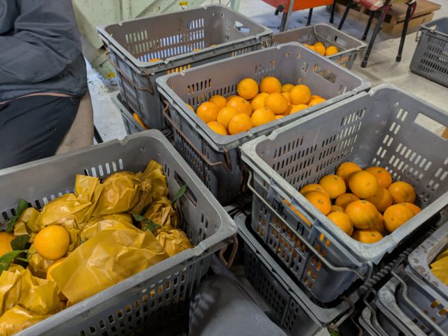 朝から頼まれている紅まどんなや南柑20号の発送準備。まずは昨日収穫した紅まどんなの袋はずし作業。針金がついているのでそれをほどきながらの作業。ほどいたあとの実は送るレベルかどうかの仕分けも。紅まどんなは果皮が弱いので選果機は使えない。奥方と二人で手よりで選果していく。なかなか時間がかかる。