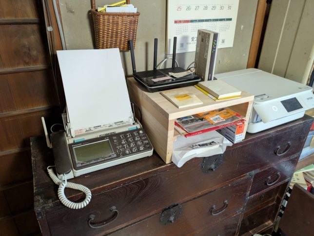 左はファックス。農家の必需品。右はちょっと前に購入したEpsonのプリンター。下のタンスは曾祖母さんが同じ町内の喜佐方から嫁入りした時に持ってきたもの。