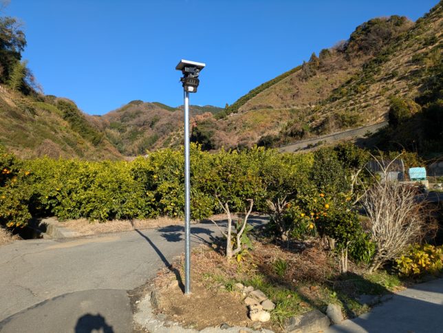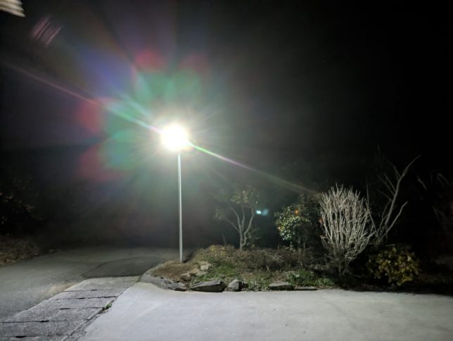 前から話はあって、我が家の前は地震の時の避難路になっていて、市の補助で街灯が設置されることになっていた。ソーラーパネルとバッテリーと電灯の組み合わせ。ソーラーパネルとバッテリの組み合わせは、先日買った電気柵のシステムとおんなじだ。夜になっても明かりがつかないので、そばに行ってみたら点いた。