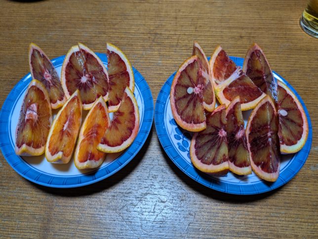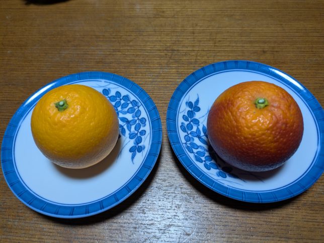 着色不良果の方に色の薄い部分があるが、似たようではある。食べて見た結果は、奥方はどちらもおいしいとか。オヤジはやはり右の方が風味と甘味が強いようだと思った。どっちもおいしいけどね。