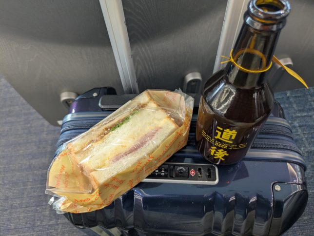 お昼は空港の出発ロビーで。売店で買ったサンドイッチと道後の地ビール。サンドイッチは温めてくれた。