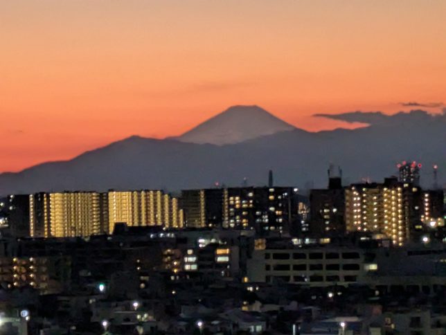 川崎で買い物をしたあと帰宅。夕景の富士山が完璧なシルエットを見せてくれた。