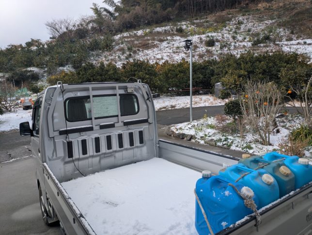 朝一は灯油の買い出し。軽トラの荷台に雪が3cmぐらい積もっていた。道路は溶けているようだが、念の為に4WDモードで買いにいく。トンネルの出入口など雪が残っていた。