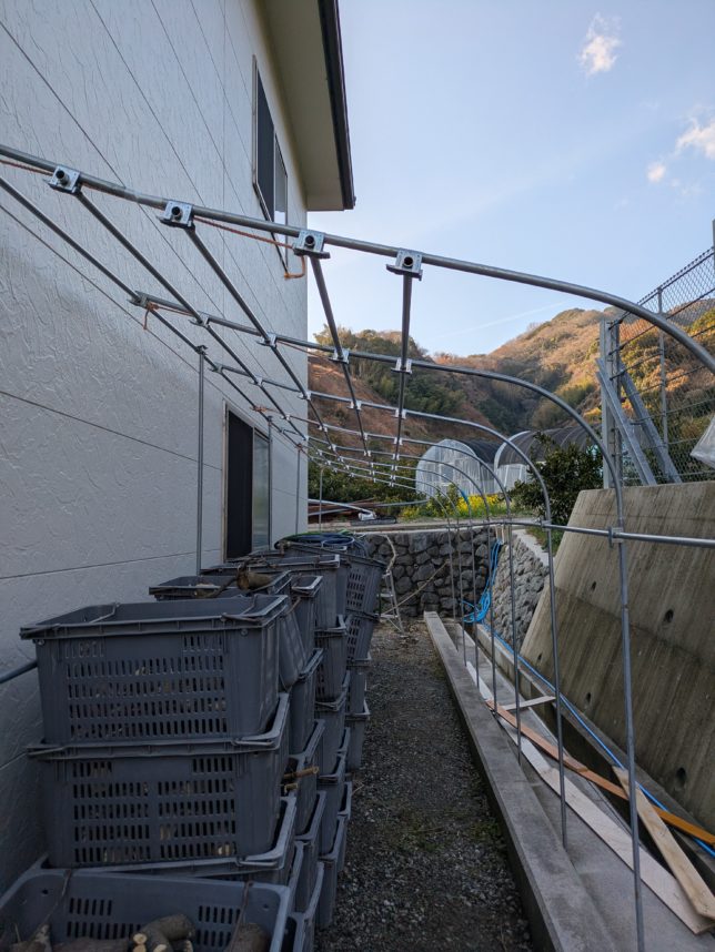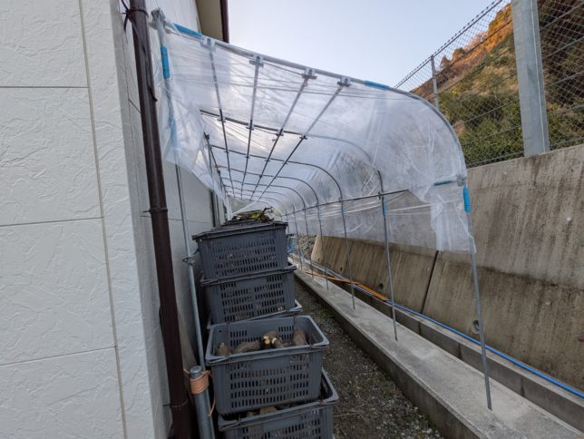 これまで骨組みが粗かったので、ビニールに水が溜まって垂れ下がっていた。これで少しは良くなるかな。
