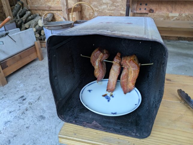 一斗缶の中の温度はだいたい120℃。30分ほど焼いた。今日もつるし焼きだ。焼きあがったのがこちら。