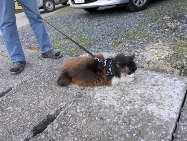 さて、怪我をしたテト君。そろそろ2週間ぐらいになるかな。ずっと家の中に閉じ込めているのだが、外に出ようとして暴れる。奥方がリードを買ってきて散歩に連れていっている。傷の方はだいぶよくなっている。