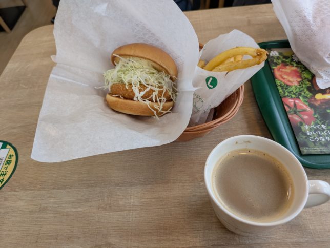 モスバーガー、海老カツバーガー、オニオンフライ、コーヒー
