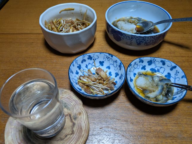 晩酌前に少し調理。いつものネギチャーシューとナマコ。お酒は日本酒をコップで。