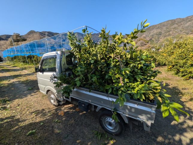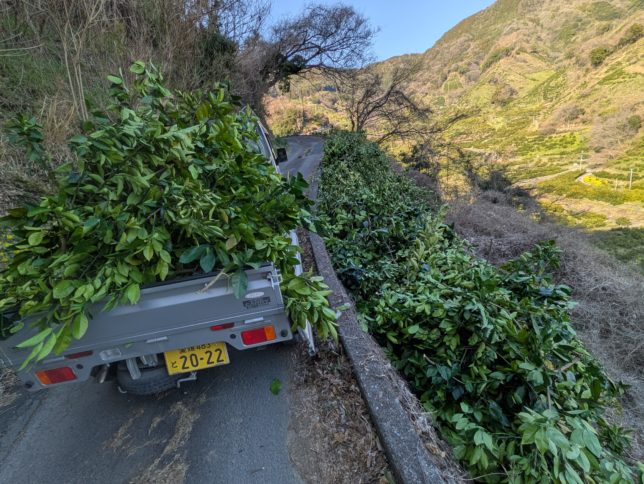 夕方までやって宇和ゴールド80杯ほど収穫。剪定ゴミは4回ほど捨てた。