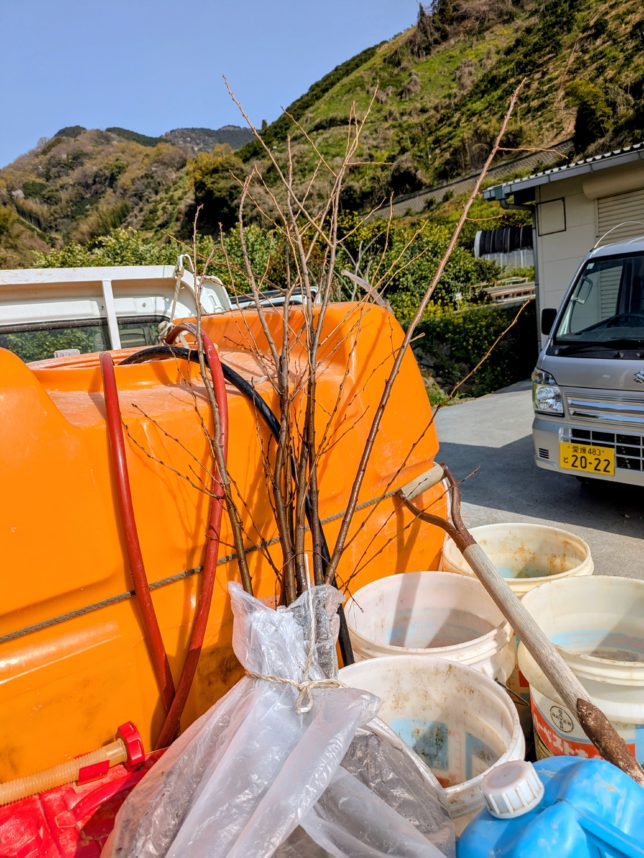 穴を掘って、植え付けて、水をやって、竹で支えて終了。2時間ほどかかった。急傾斜地の作業はしんどい。廃園にしてよかった。去年植えた9本の苗木たちも元気だ。もうすぐ芽がでてきそう。傾斜地に桜がさくのを楽しみに老後を過ごそうか。一昨年植えた3本も元気。もうすぐ花が咲きそうだ。