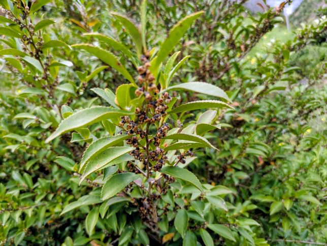 シオカラ地区で穴掘りをしていて、強烈な匂いがしてきた。毎年この季節に匂う。こちらが匂いのもと。ヒサカキだ。