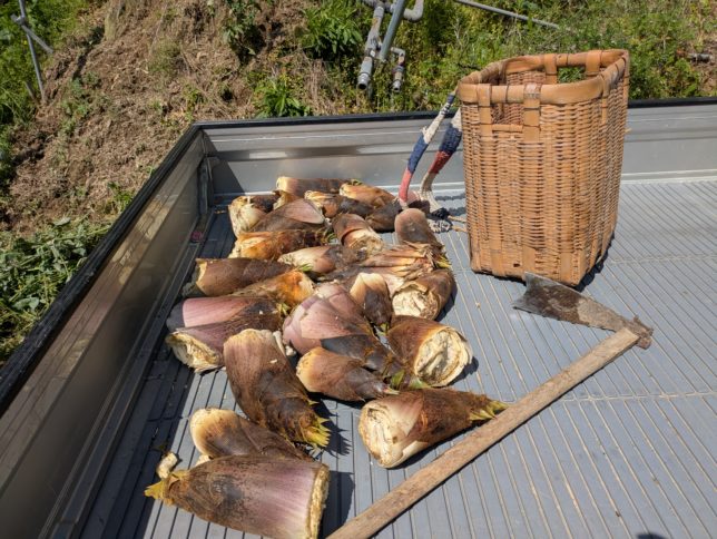 今日もいい天気。腰の調子はまずまず。いろいろ筍情報が入ってくるのだが、忙しくて行けなかったのだが今日は決行。竹カゴを背負って、鍬をたずさえて行司が谷南園地の急斜面を登っていく。下の方は先客(イノシシ)がいたらしく、食い荒らされている。もっと登っていくといっぱい筍が出ていた。イノシシのおこぼれということ。背負った竹カゴがすぐに重くなってくる。二回登り降りして25本ほど収穫。
